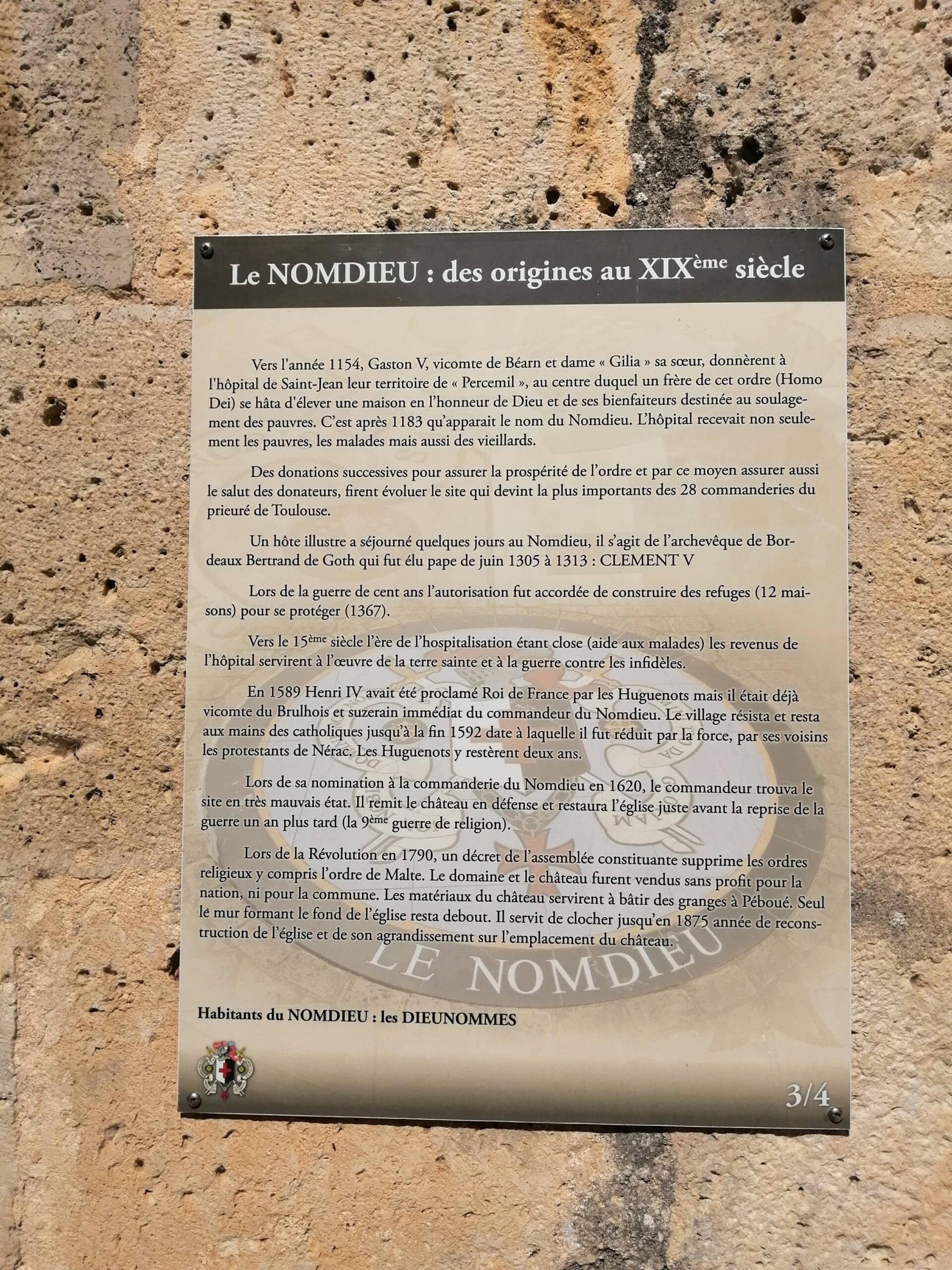 Petit village situé dans la vallée de l’ Auvignon, à quelques kilomètres de Francescas, le Nomdieu s’est organisé autour de la commanderie des hospitaliers de Saint Jean de Jérusalem au XII ème siècle. Ses habitants au nombre d’environ 200 portent le joli nom de « Dieunommés »